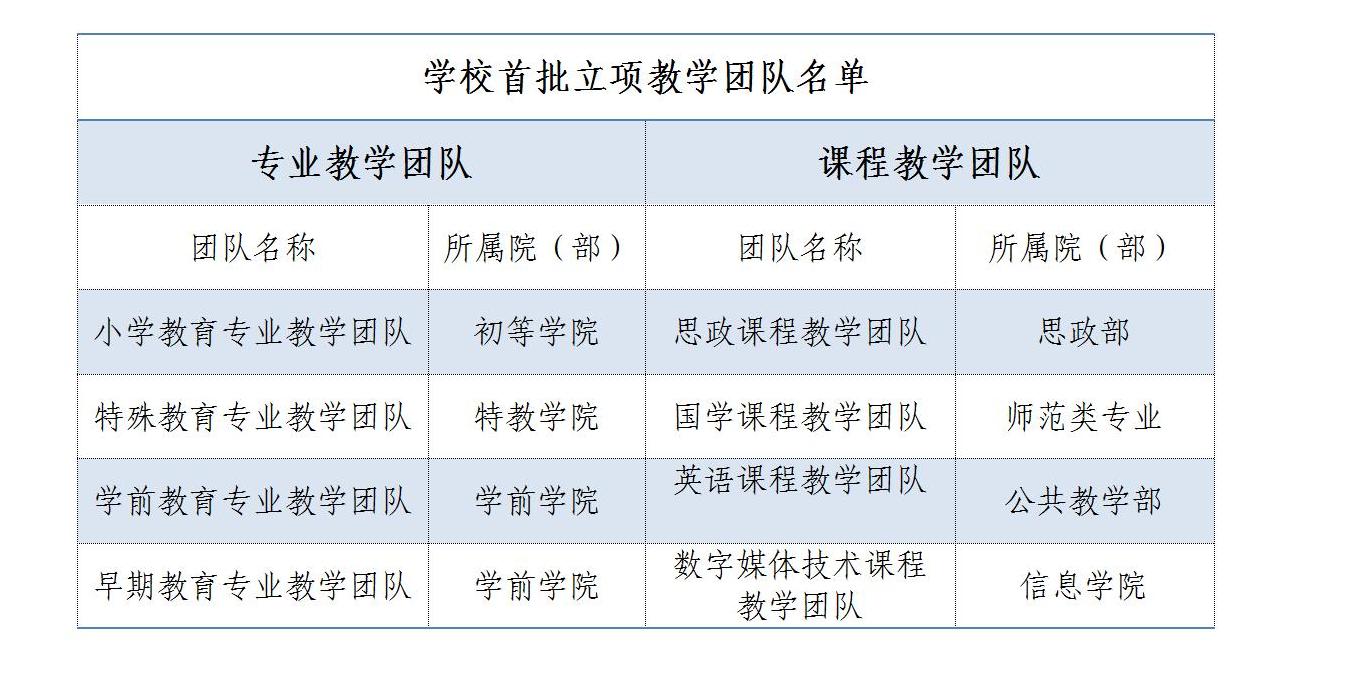 经各学院推荐,共有14个团队申报教师教学团队,其中以相关专业为依托的教学团队有6个,以课程为依托的教学团队有8个。综合学校目前各学院专业现状及各专业课程结构的基本情况,经校外专家现场评审与指导建议,学校决定分批次进行教学团队建设,首批重点打造4个专业和4个课程教学团队。