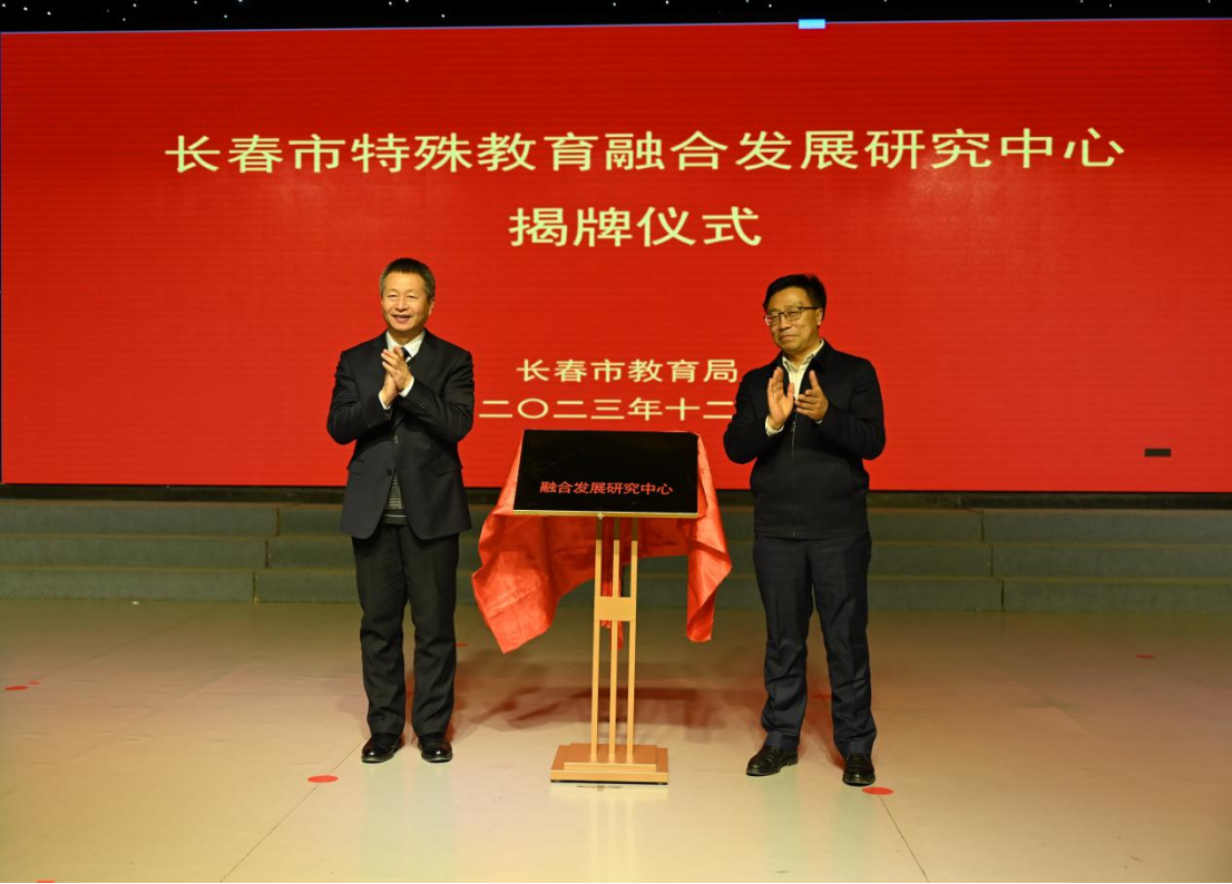 会上,长春市教育局党组成员、副局长李亚君与国产一区二区日本在线党委副书记、校长姜国权共同为“长春市特殊教育融合发展研究中心”揭牌。