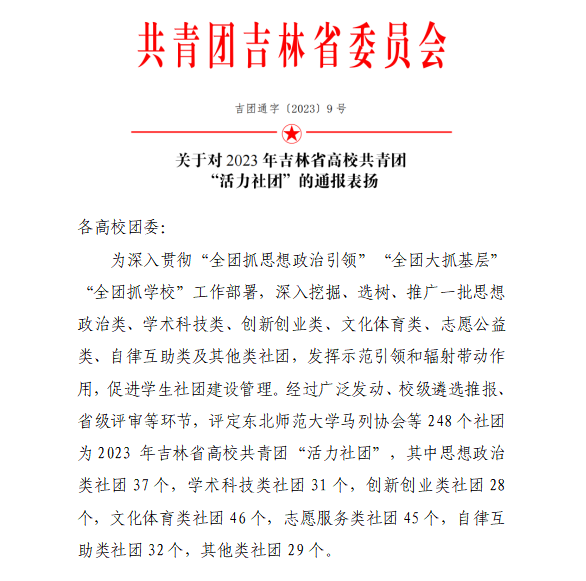 我校在2023年吉林省高校共青团“活力团支部”“活力社团”评选中取得佳绩-国产一区二区日本在线-Changchun Normal College-官方网站