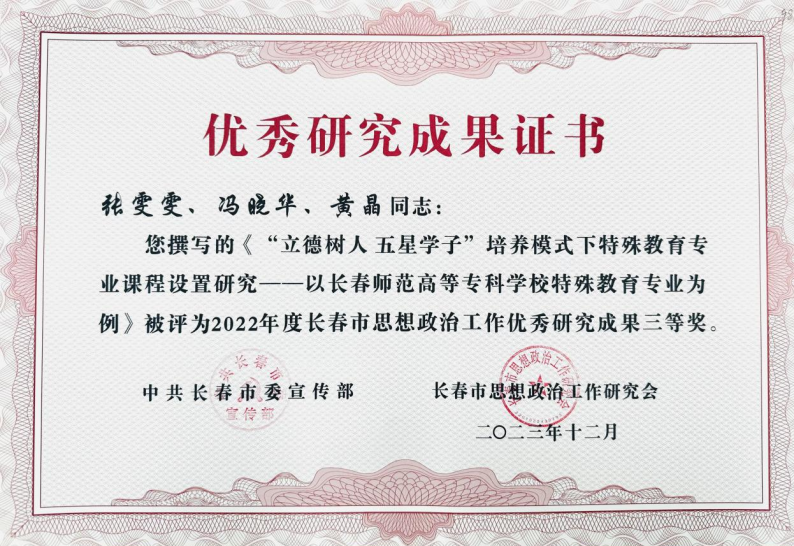 我校申报的《以习近平新时代中国特色社会主义思想为指引 着力深化思想政治教育“三全育人”综合改革》获得一等奖,《“以思政课教师队伍建设推进高职院校思政课内涵式发展”研究报告》、《“立德树人 五星学子”培养模式下特殊教育专业课程设置研究——以国产一区二区日本在线特殊教育专业为例》获得三等奖。