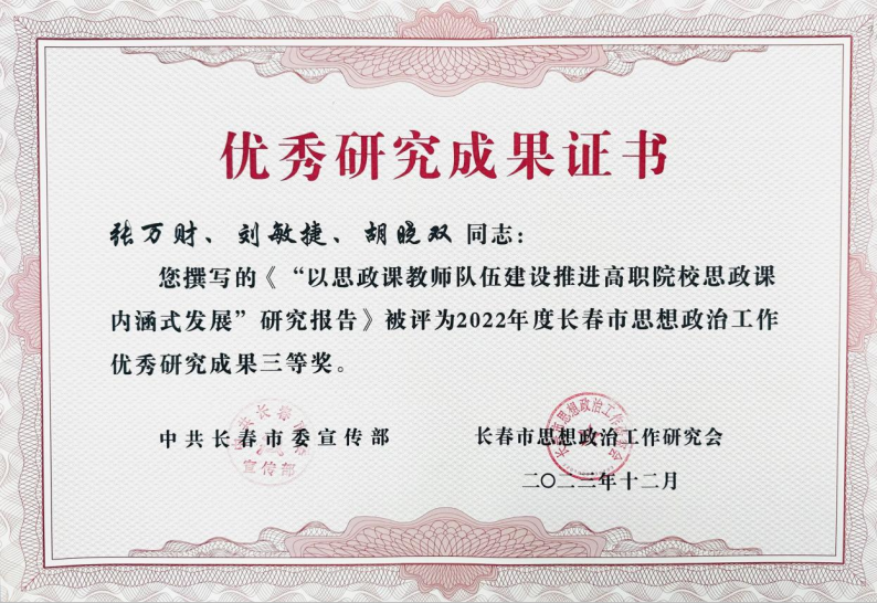 近日,中共长春市委宣传部、长春市思想政治工作研究会联合下发了《关于表彰2022年度长春市思想政治工作优秀研究单位和优秀研究成果的决定》,公布了长春市2022年度思想政治工作优秀研究单位和优秀研究成果的评选结果,共有35个单位获评优秀研究单位,150篇研究成果获评优秀研究成果。我校报送的作品获得一等奖1项,三等奖2项,学校获得2022年度长春市思想政治工作优秀研究单位荣誉称号。