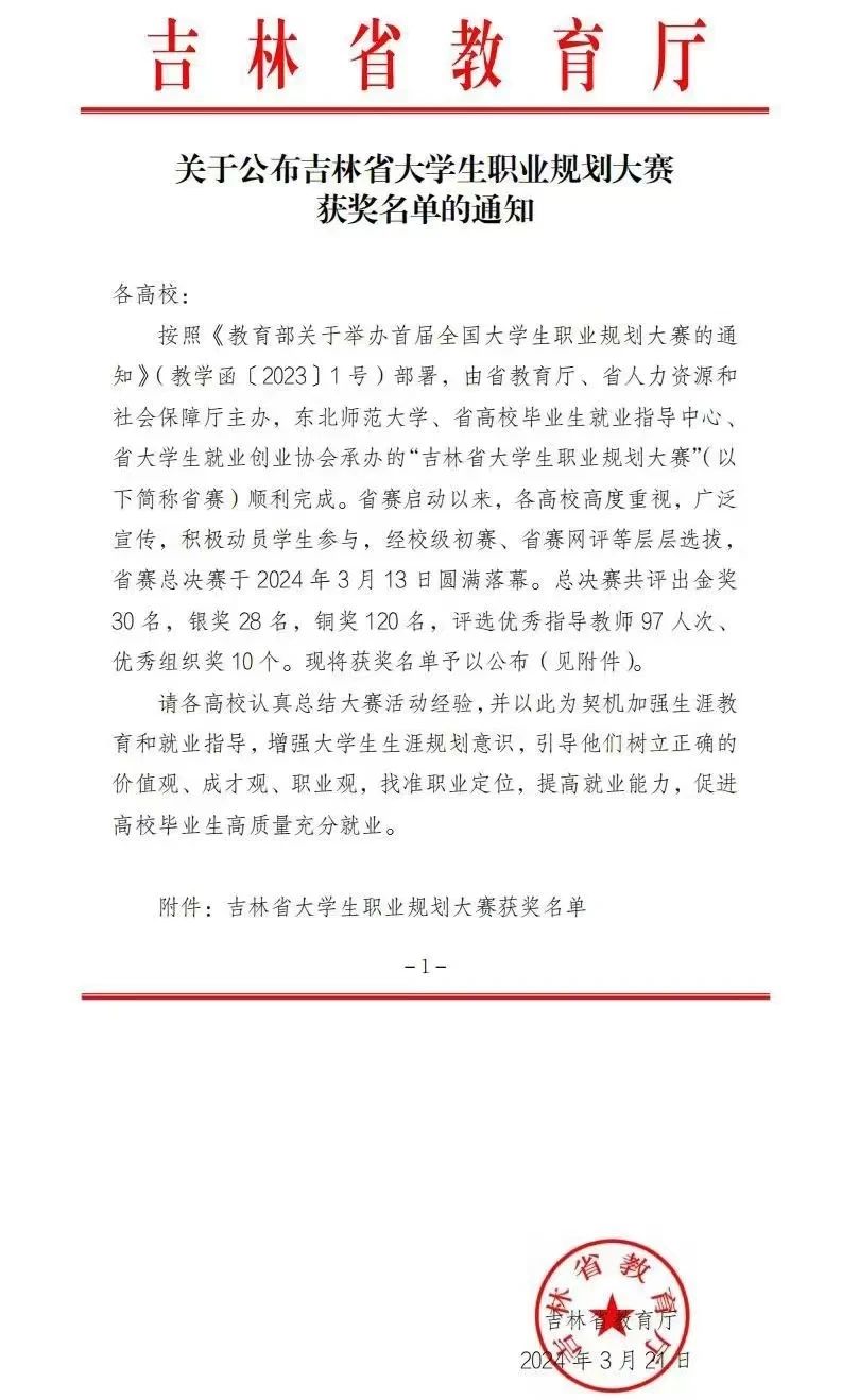 近日,由吉林省教育厅、吉林省人力资源和社会保障厅主办,东北师范大学、吉林省高校毕业生就业指导中心、吉林省大学生就业创业协会承办的“吉林省大学生职业规划大赛”落下帷幕。此次大赛吸引力了来自全省66所高校的近11万名学生参与,最终有594名选手入围省级初赛,60名选手晋级总决赛。