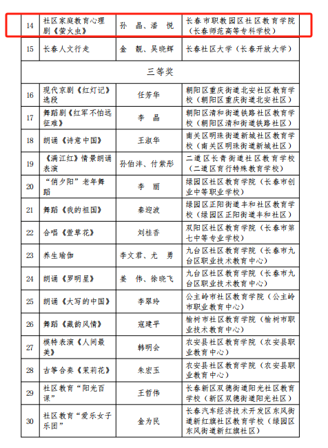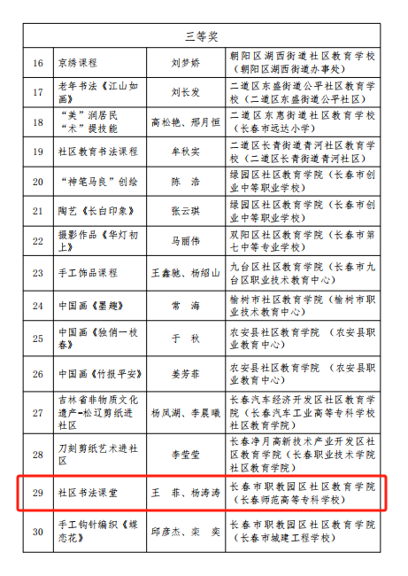 为深入学习宣传贯彻党的二十大精神,以高质量发展推进学习型社会建设,提高社区教育教学质量,长春市教育局开展2024年长春市社区教育教学成果评选活动,共产生60项获奖项目,我校凭借出色的教育成果和在社区教育中所做的突出贡献,在全市众多参评单位中脱颖而出,喜获多项荣誉。