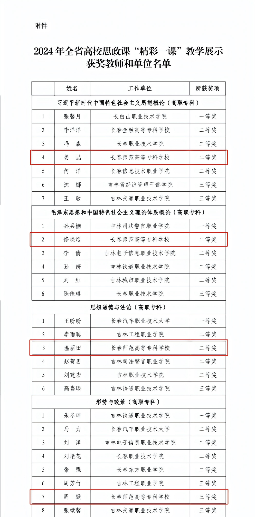近日,吉林省教育厅公布了2024年全省高校思政课“精彩一课”教学展示活动结果,我校马克思主义学院教师荣获二等奖3项、三等奖1项。
