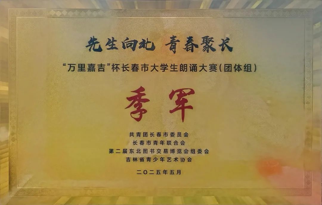 近日,由共青团长春市委员会主办的“先生向北 青春聚长”万里嘉吉杯长春市大学生朗诵大赛圆满落幕。本次比赛共吸引来自长春市内10余所高校参赛选手同台竞技,我校23级学生刘美慧、唐博洋、王欣聪;24级学生韩馥宇、高楷雯、张圣漫6名同学,在董凌辰老师的带领下,荣获季军,为我校争得了荣誉。