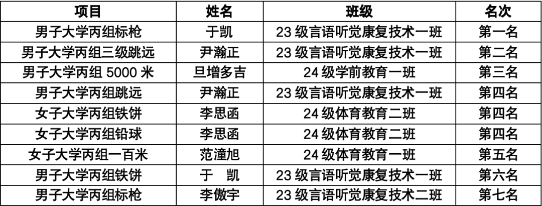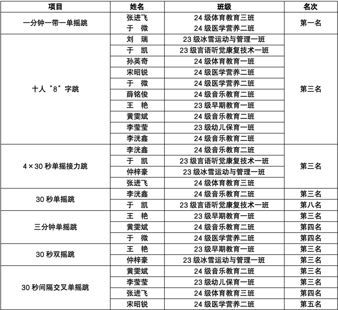 近日,2025年吉林省大学生田径锦标赛与跳绳锦标赛先后举行,来自全省多所高校的运动员齐聚赛场,展开激烈角逐。我校组织田径队和跳绳队积极参赛,在两项赛事中均取得优异成绩,充分展现了我校学生昂扬向上的精神风貌和扎实过硬的体育素养。