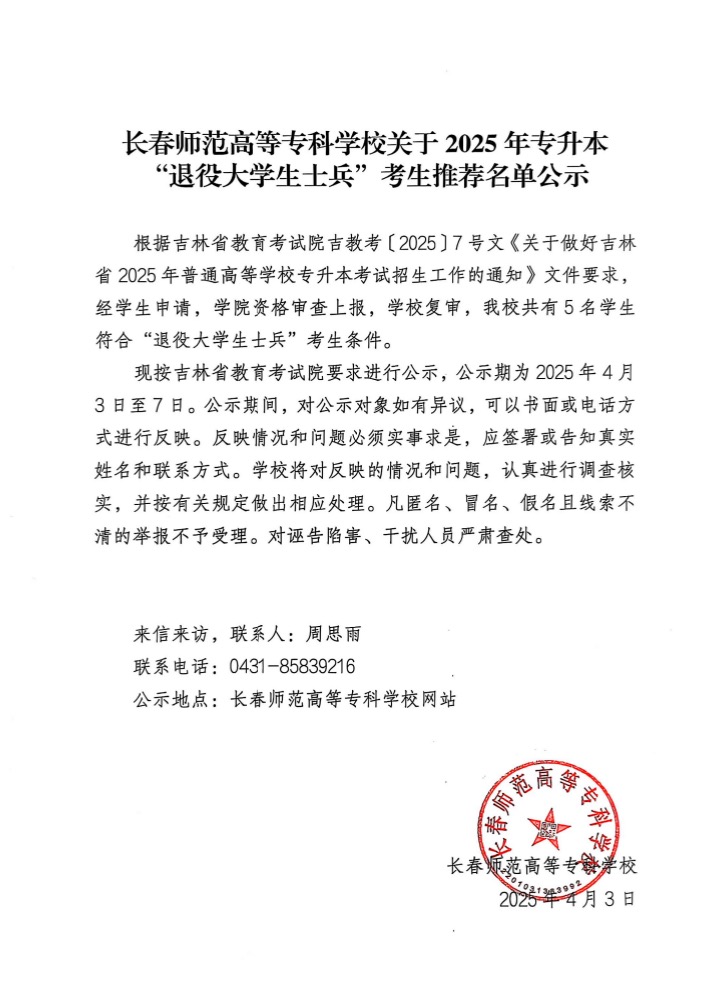 根据吉林省教育考试院吉教考〔2025〕7号文《关于做好吉林省2025年普通高等学校专升本考试招生工作的通知》文件要求,经学生申请,学院资格审查上报,学校复审,我校共有5名学生符合“退役大学生士兵”考生条件,现公示如下: