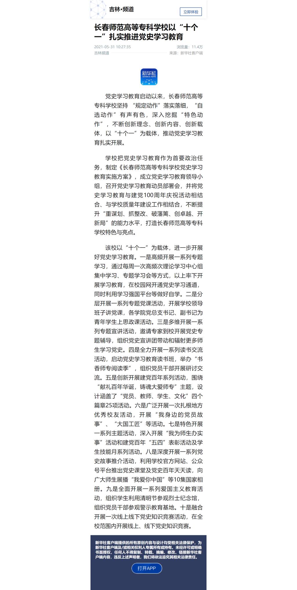 该校以“十个一”为载体,进一步开展好党史学习教育。一是高频开展一系列专题学习,通过每周一次高频次理论学习中心组集中学习、专题学习会等方式,以上率下开展学习教育,在校园网开通党史学习通道,同时利用学习强国平台等做好自学。二是分层开展一系列专题党课活动,开展学校领导班子讲党课,各学院党总支书记、副书记为青年学生上思政课活动。三是多维开展一系列专题宣讲活动,邀请专家到校开展党史专题辅导,组织党史宣讲团带动和辐射更多师生学习党史。四是全力开展一系列读书交流活动,启动党史学习教育读书班,举办“书香师专阅读季”,组织党员干部开展研讨交流。五是创新开展建党百年系列活动,围绕“献礼百年华诞,铸魂大爱师专”主题,设计涵盖了“党员、教师、学生、文化”四个篇章25项活动。六是广泛开展一次扎根地方优秀校友活动,开展“我身边的党员故事”、“大国工匠”等活动。七是特色开展一系列主题活动,深入开展“我为师生办实事”活动和建党百年“五四”表彰活动及学生技能月系列活动。八是深度开展一系列党史故事推介活动,利用学校官方网站、公众号平台推出党史课堂及党史百年天天读,向广大师生展播“我爱你中国”等10集国家相册。九是全面开展一系列爱国主义教育活动,组织学生利用清明节参观烈士纪念馆,组织党员干部参观警示教育基地。十是融合开展一次线上线下党史知识竞赛活动,在全校范围内开展线上、线下党史知识竞赛。