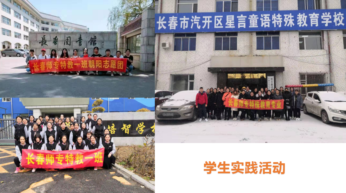特殊教育学院,现有特殊教育和老年服务与管理两个专业,其中特殊教育专业为吉林省特色高水平专业。学院创办于1987年,是我国最早的特殊教育师资培养学校之一。拥有专任教师20人,其中教授1人,副教授13人,硕士及以上学历18人。“双师”型教师7人,长春市特殊教育专业学科带头人1人,吉林省特殊教育各类专家14人,中国特殊教育专业培训师资10人。多年来,学院培养了1800多名优秀的特殊教育专业师资,特岗教师考取率连续四年省内第一,荣获中国职教集团学生融合教学技能大赛一等奖。多次获得省、市创新创业大赛一、二等奖。学院以“产教融合”“医教结合”为指导思想,以融合教育、康复教育为办学特色,以提高学生教育及康复训练技能为重点,以培养高素质技能型专业人才为中心,构建布局合理、学段衔接、普职融通、医教结合的特殊教育体系,力争办学水平为省内一流、国内知名的“吉林省特殊教育师资培养的摇篮”。